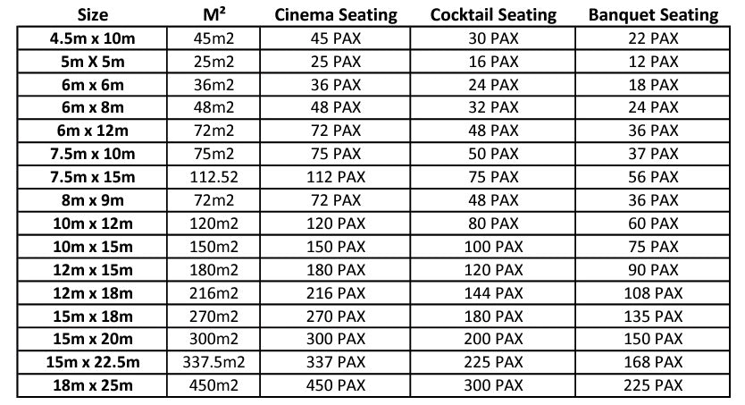 Size M² Cinema Seating Cocktail Seating Banquet Seating